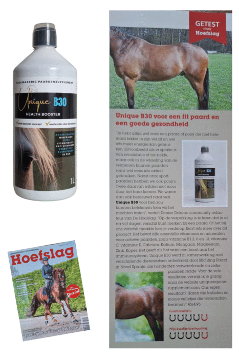 Unique B30 health booster draagt bij aan meer energie, sterkere spieren, en een betere algehele weerstand. Het ondersteunt het immuunsysteem, het zenuwstelsel en de aanmaak van gezonde bloedcellen – essentieel bij herstel, verminderde vitaliteit en bloedarmoede bij paarden. De unieke mix van B-vitaminen, mineralen, antioxidanten en aminozuren maakt dit supplement breed inzetbaar en effectief.